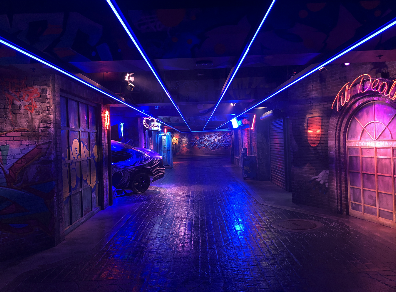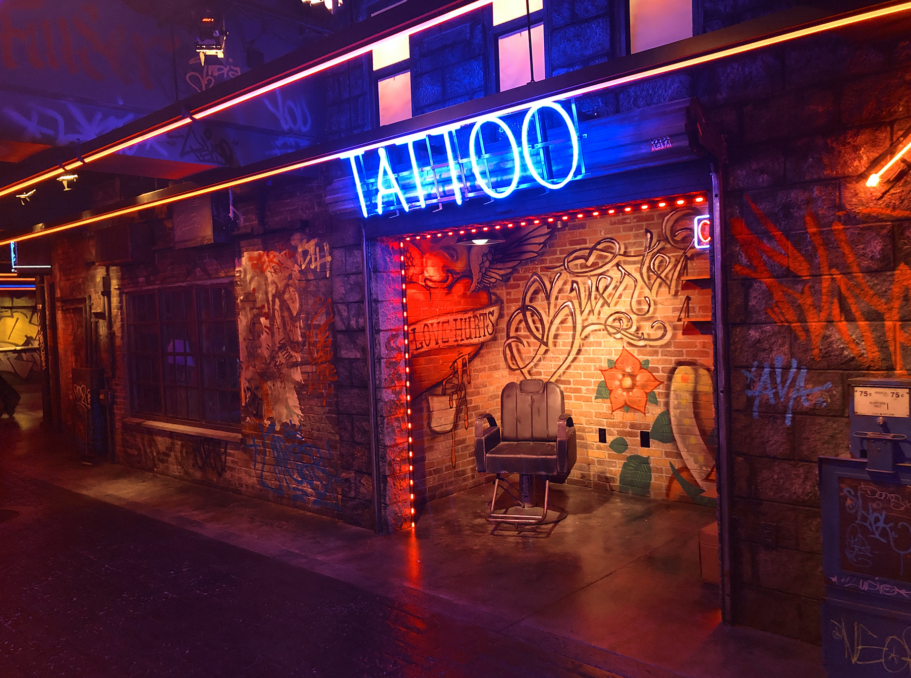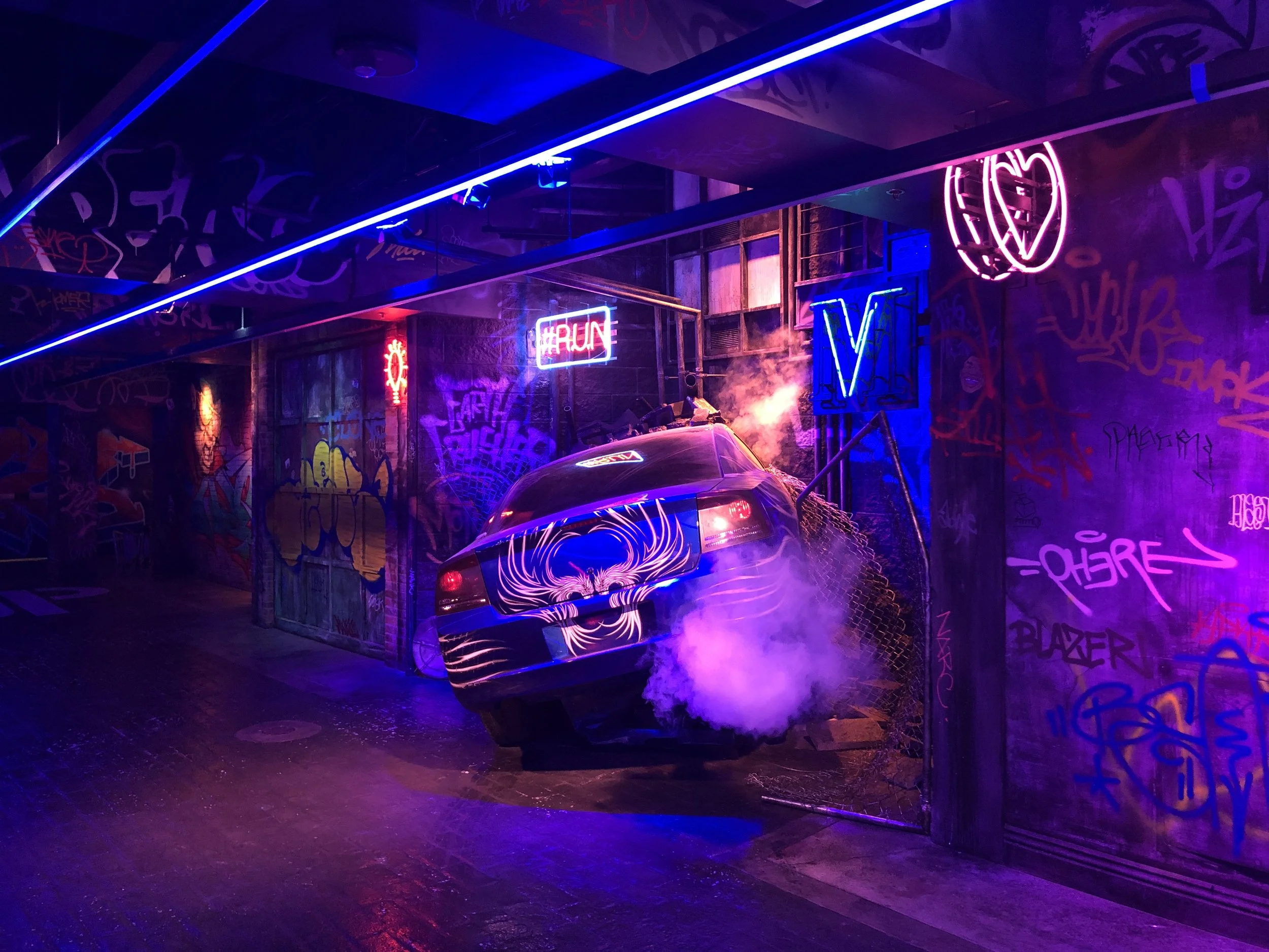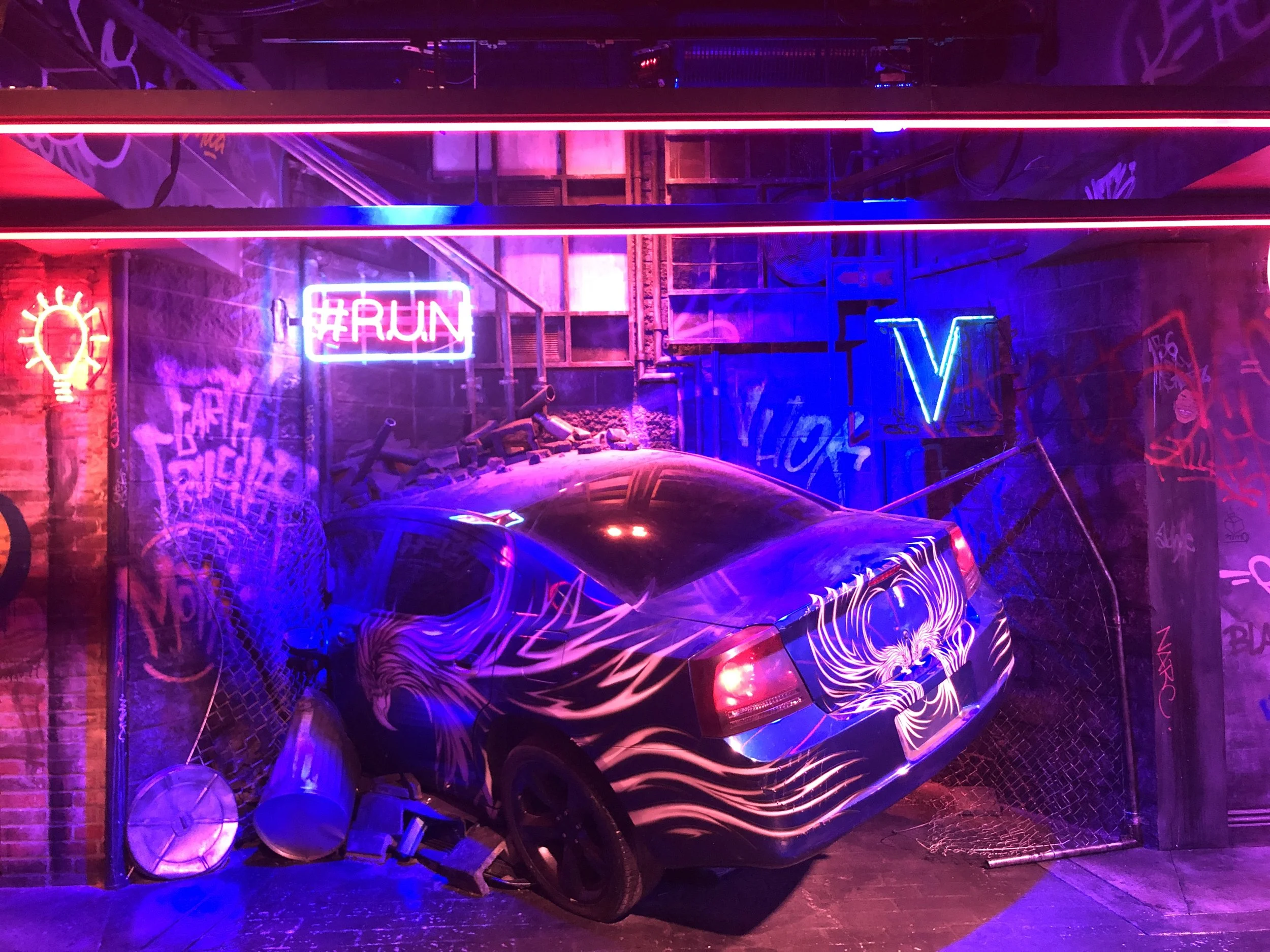 As the show was set in a near dystopian future with action-packed sequences, my idea was to immerse right away in the show’s world. They would enter through a dodgy, dark alley filled with interactive experiences. A projection-mapping tattoo parlor, an animated crashed car, directional speakers, shady characters approaching you in a dim-lit environment, everything was in place to set the mood from the moment you stepped in.