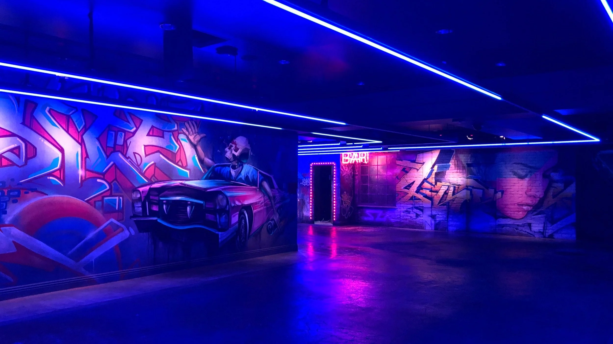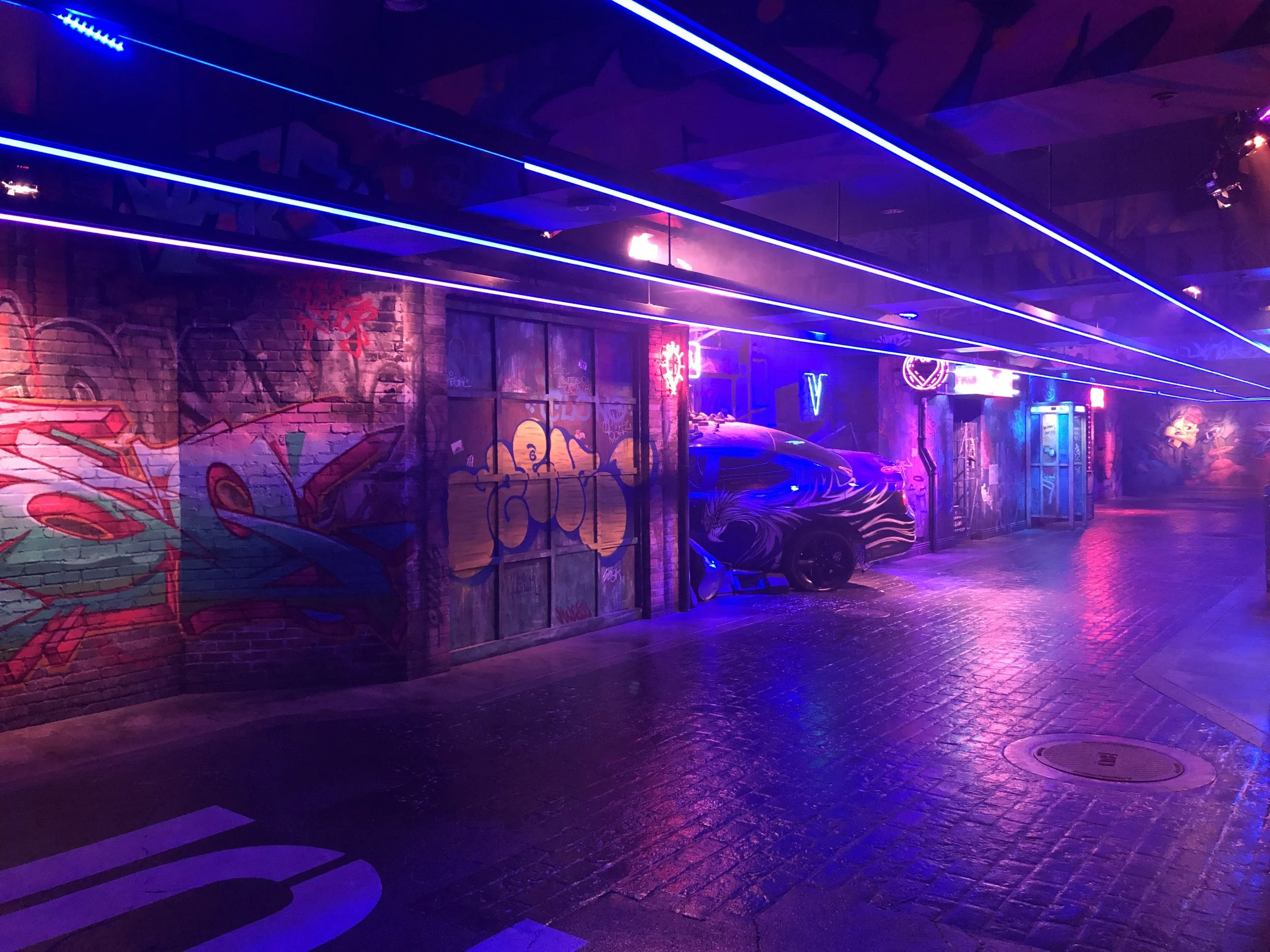 Entering the alleyway, you discovered some kind of shady underground Las Vegas where everything was interactive and moving. A crashed car, a shady bar, a sketchy tattoo parlour all neon-lit… everything was there to give you that feeling of excitement and curiosity.