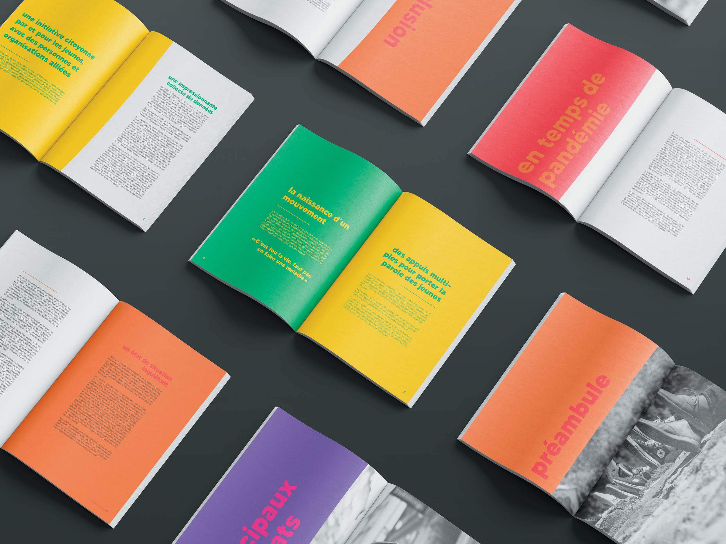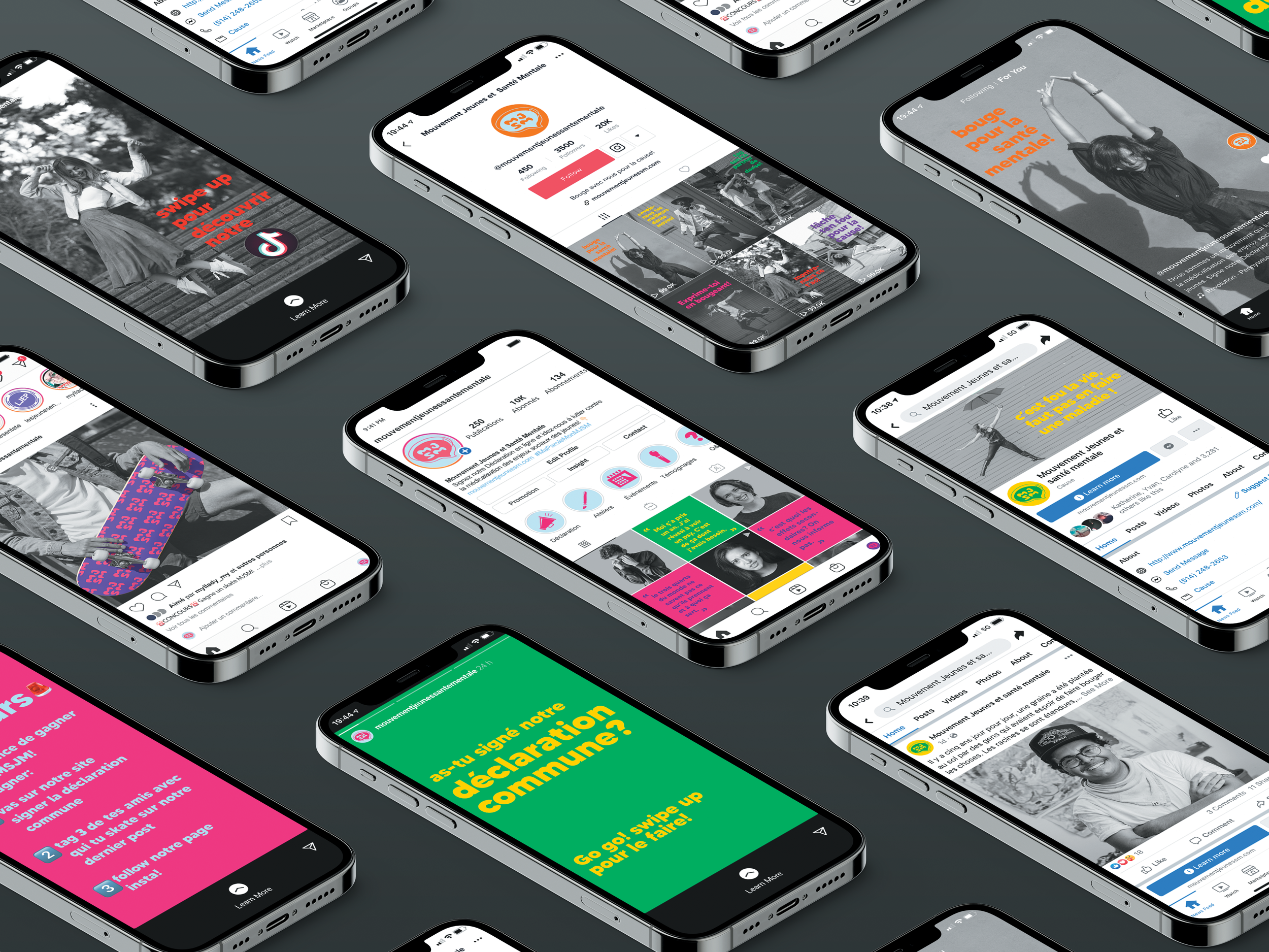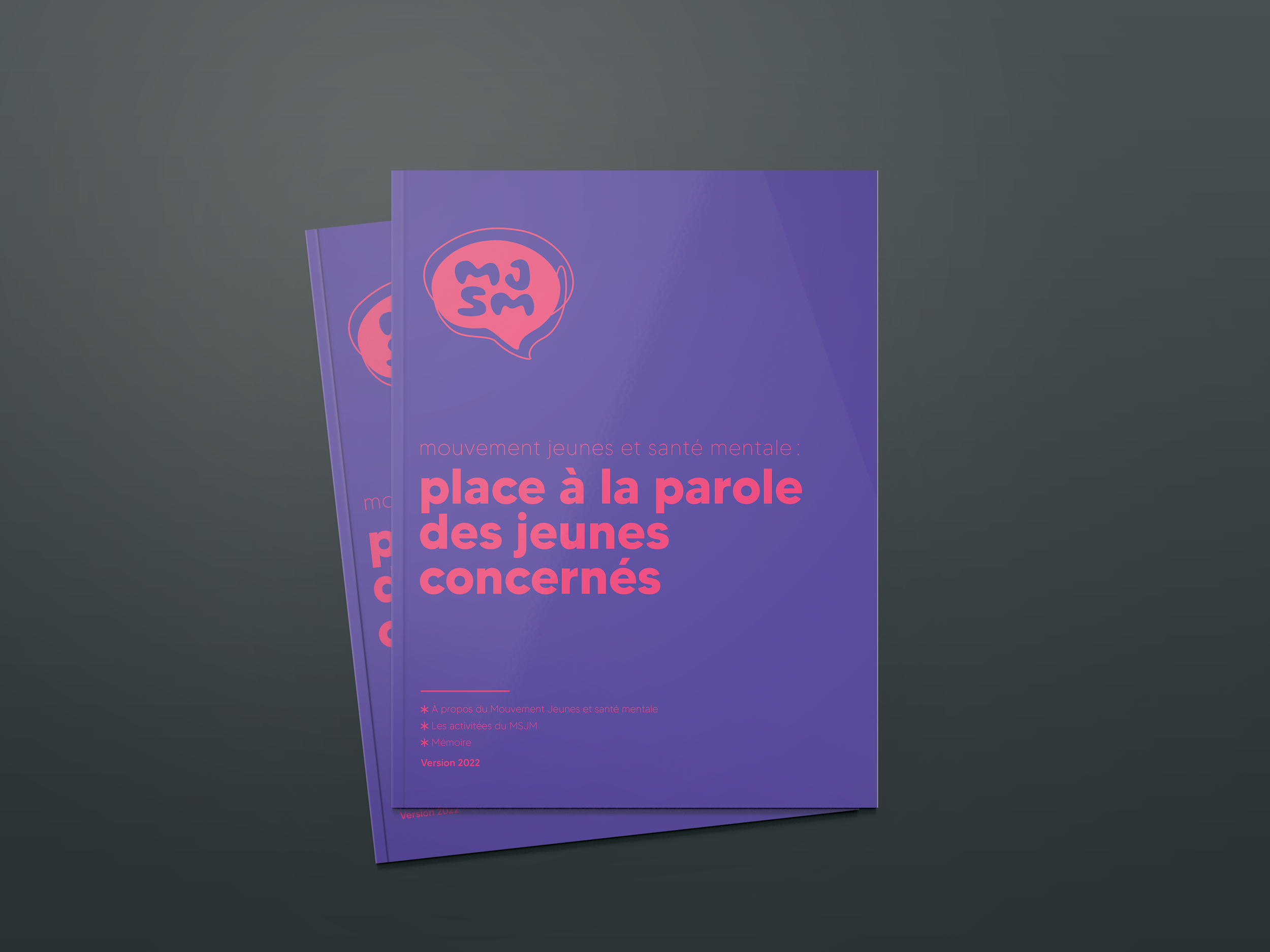 The Mouvement Jeunes et Santé Mentale (MSJM) is a movement that fights against the medicalization of social issues experienced by young people between the ages of 14 and 35. In search of a refreshed brand image, we worked to create a new graphic universe for them, print and digital communications as well as a range of products, all so that they could better address their broad target and stand out from other organizations and movements. The project was carried out in collaboration with Danja Codina (designer) and Carolyne Fabre (designer) and was a finalist during the pitch period.