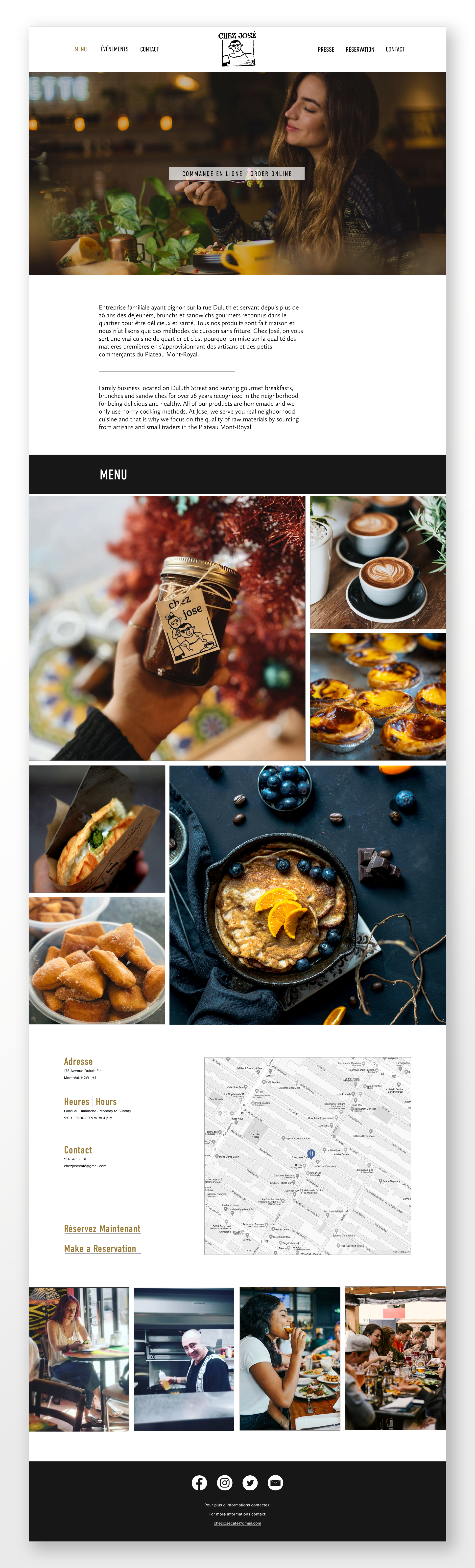 Chez José Café was a personal project I took upon to hone my skills a web designer. One day I was walking in the neighbourhood and decided to stop at Chez José Café to grab some food and decided to check out their website which turned out to be in need of a refreshment. I did not reflect the experience I just had at the café. The goal was to make the website easier to navigate and quickly find information about the small business while showcasing some of their signature dishes.